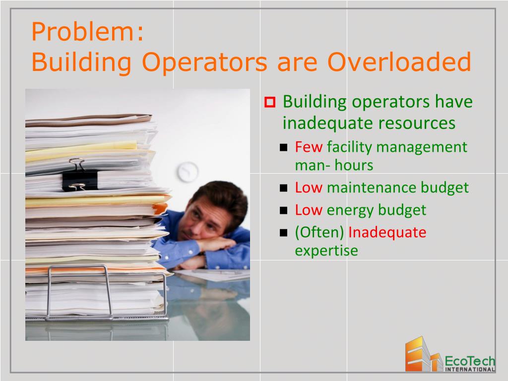 Problem:Building Operators are Overloaded • Building operators have inadequate resources • Few facility management man- hours • Low maintenance budget • Low energy budget • (Often) Inadequate expertise