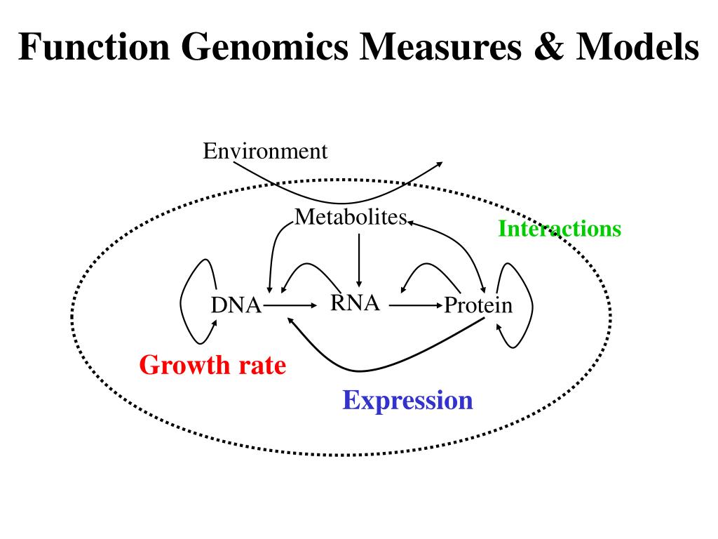 Function Genomics Measures & Models Environment Metabolites Interactions RNA DNA Protein Growth rate Expression