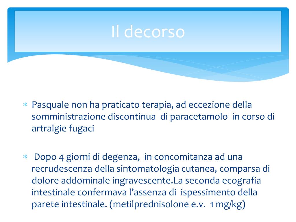 Il decorso Pasquale non ha praticato terapia, ad eccezione della somministrazione discontinua di paracetamolo in corso di artralgie fugaci Dopo 4 giorni di degenza, in concomitanza ad una recrudescenza della sintomatologia cutanea, comparsa di dolore addominale ingravescente.La seconda ecografia intestinale confermava l’assenza di ispessimento della parete intestinale. (metilprednisolonee.v. 1 mg/kg)