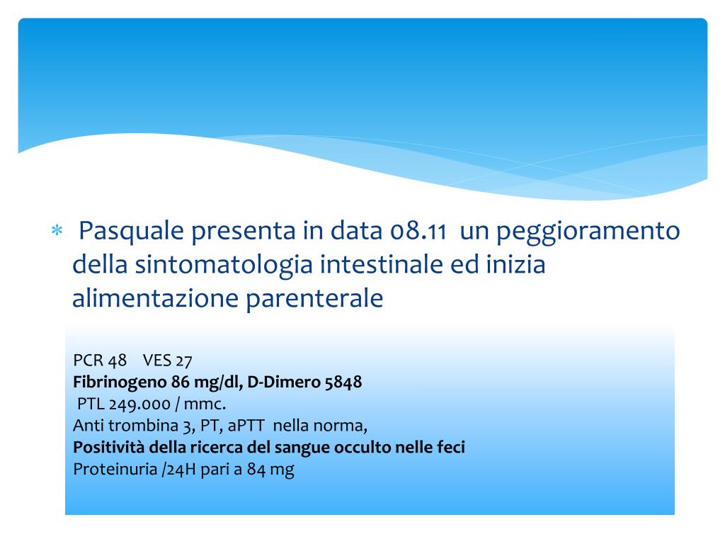 Pasquale presenta in data 08.11 un peggioramento della sintomatologia intestinale ed inizia alimentazione parenterale