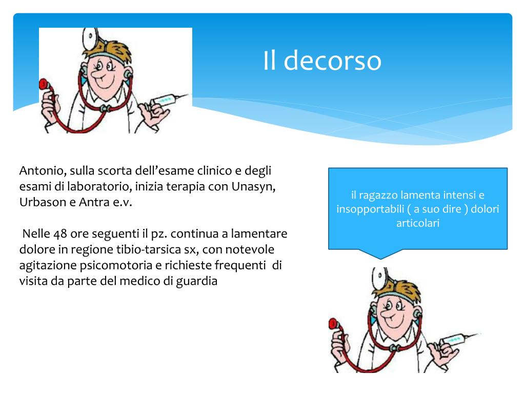 Il decorso Antonio, sulla scorta dell’esame clinico e degli esami di laboratorio, inizia terapia con Unasyn, Urbason e Antrae.v. Nelle 48 ore seguenti il pz. continua a lamentare dolore in regione tibio-tarsica sx, con notevole agitazione psicomotoria e richieste frequenti di visita da parte del medico di guardia il ragazzo lamenta intensi e insopportabili ( a suo dire ) dolori articolari