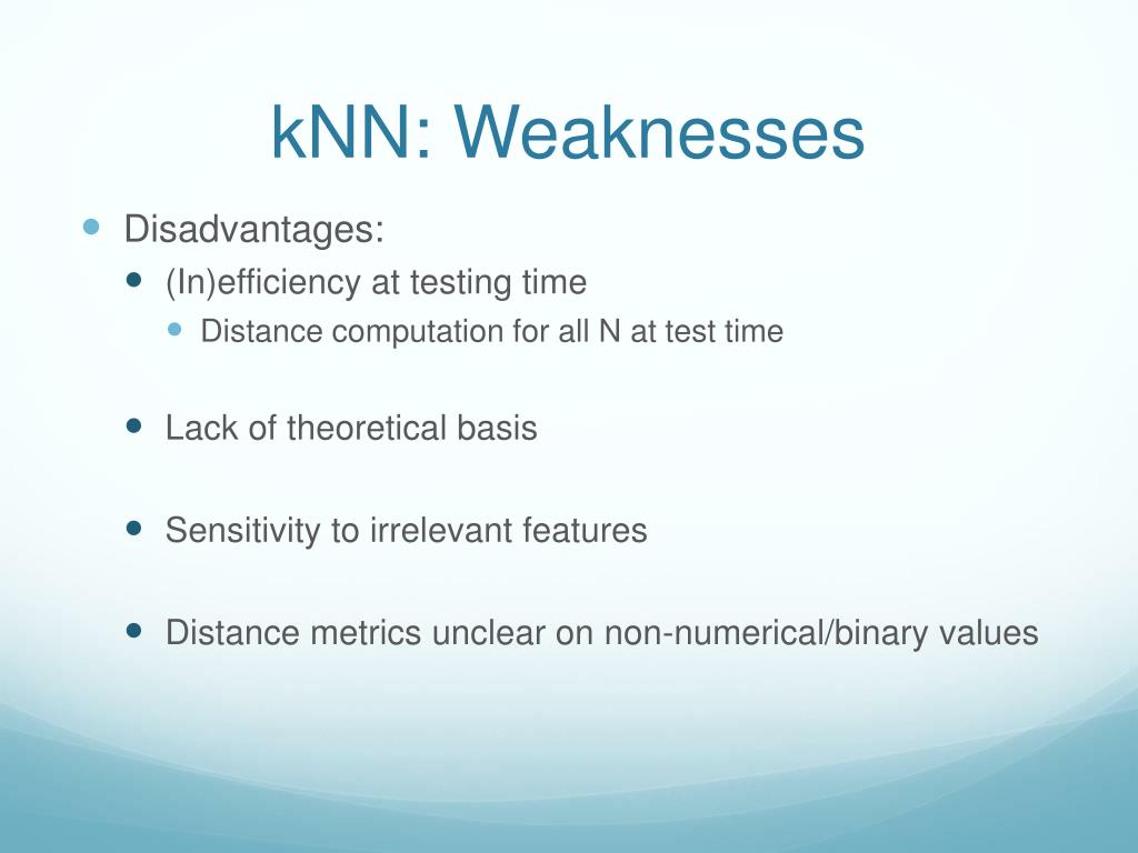 kNN: Weaknesses • Disadvantages: • (In)efficiency at testing time • Distance computation for all N at test time • Lack of theoretical basis • Sensitivity to irrelevant features • Distance metrics unclear on non-numerical/binary values