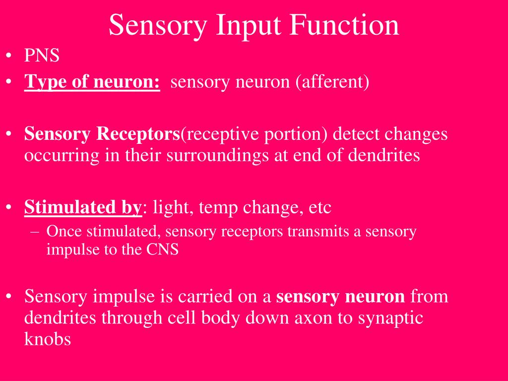 Sensory Input Function • PNS • Type of neuron: sensory neuron (afferent) • Sensory Receptors(receptive portion) detect changes occurring in their surroundings at end of dendrites • Stimulated by: light, temp change, etc • Once stimulated, sensory receptors transmits a sensory impulse to the CNS • Sensory impulse is carried on a sensory neuron from dendrites through cell body down axon to synaptic knobs