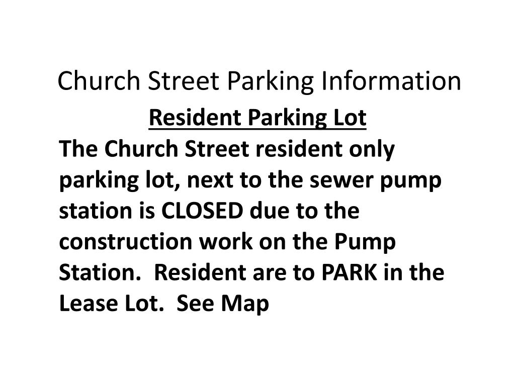 Church Street Parking Information Resident Parking Lot The Church Street resident only parking lot, next to the sewer pump station is CLOSED due to the construction work on the Pump Station. Resident are to PARK in the Lease Lot. See Map