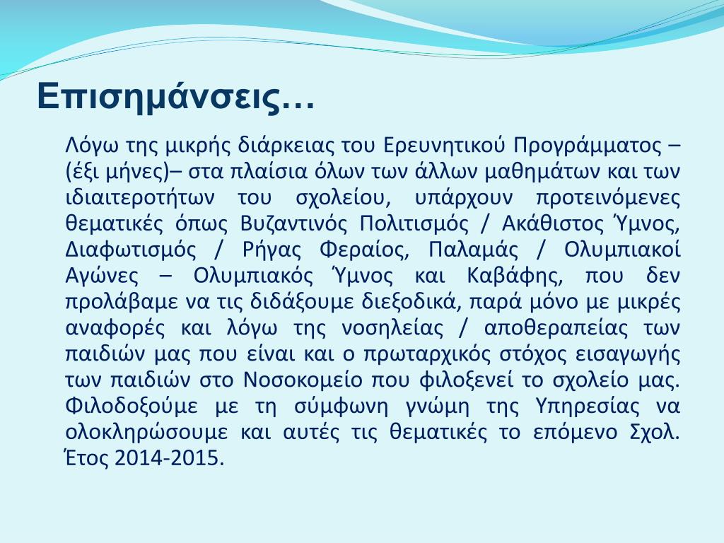 Επισημάνσεις… Λόγω της μικρής διάρκειας του Ερευνητικού Προγράμματος –(έξι μήνες)– στα πλαίσια όλων των άλλων μαθημάτων και των ιδιαιτεροτήτων του σχολείου, υπάρχουν προτεινόμενες θεματικές όπως Βυζαντινός Πολιτισμός / Ακάθιστος Ύμνος, Διαφωτισμός / Ρήγας Φεραίος, Παλαμάς / Ολυμπιακοί Αγώνες – Ολυμπιακός Ύμνος και Καβάφης, που δεν προλάβαμε να τις διδάξουμε διεξοδικά, παρά μόνο με μικρές αναφορές και λόγω της νοσηλείας / αποθεραπείας των παιδιών μας που είναι και ο πρωταρχικός στόχος εισαγωγής των παιδιών στο Νοσοκομείο που φιλοξενεί το σχολείο μας. Φιλοδοξούμε με τη σύμφωνη γνώμη της Υπηρεσίας να ολοκληρώσουμε και αυτές τις θεματικές το επόμενο Σχολ. Έτος 2014-2015.