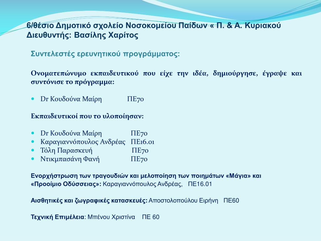 6/θέσιο Δημοτικό σχολείο Νοσοκομείου Παίδων « Π. & Α. ΚυριακούΔιευθυντής: Βασίλης Χαρίτος Συντελεστές ερευνητικού προγράμματος: Ονοματεπώνυμο εκπαιδευτικού που είχε την ιδέα, δημιούργησε, έγραψε και συντόνισε το πρόγραμμα: • Dr Κουδούνα Μαίρη ΠΕ70 Εκπαιδευτικοί που το υλοποίησαν: • Dr Κουδούνα Μαίρη ΠΕ70 • Καραγιαννόπουλος Ανδρέας ΠΕ16.01 • Τόλη Παρασκευή ΠΕ70 • Ντικμπασάνη Φανή ΠΕ70 Ενορχήστρωση των τραγουδιώνκαι μελοποίηση των ποιημάτων «Μάγια» και «Προοίμιο Οδύσσειας»: Καραγιαννόπουλος Ανδρέας, ΠΕ16.01 Αισθητικές και ζωγραφικέςκατασκευές: Αποστολοπούλου Ειρήνη ΠΕ60 Τεχνική Επιμέλεια: Μπένου Χριστίνα ΠΕ 60