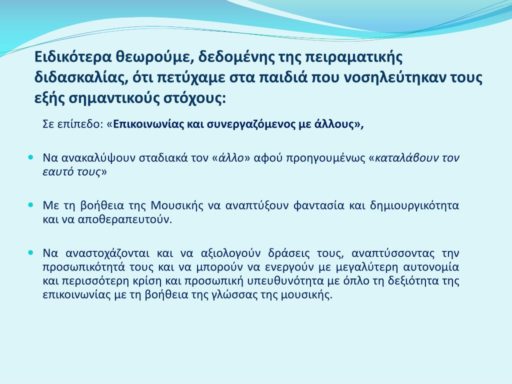 Ειδικότερα θεωρούμε, δεδομένης της πειραματικής διδασκαλίας, ότι πετύχαμε στα παιδιά που νοσηλεύτηκαν τους εξής σημαντικούς στόχους: Σε επίπεδο: «Επικοινωνίας και συνεργαζόμενος με άλλους», • Να ανακαλύψουν σταδιακά τον «άλλο» αφού προηγουμένως «καταλάβουν τον εαυτό τους» • Με τη βοήθεια της Μουσικής να αναπτύξουν φαντασία και δημιουργικότητα και να αποθεραπευτούν. • Να αναστοχάζονται και να αξιολογούν δράσεις τους, αναπτύσσοντας την προσωπικότητά τους και να μπορούν να ενεργούν με μεγαλύτερη αυτονομία και περισσότερη κρίση και προσωπική υπευθυνότητα με όπλο τη δεξιότητα της επικοινωνίας με τη βοήθεια της γλώσσας της μουσικής.