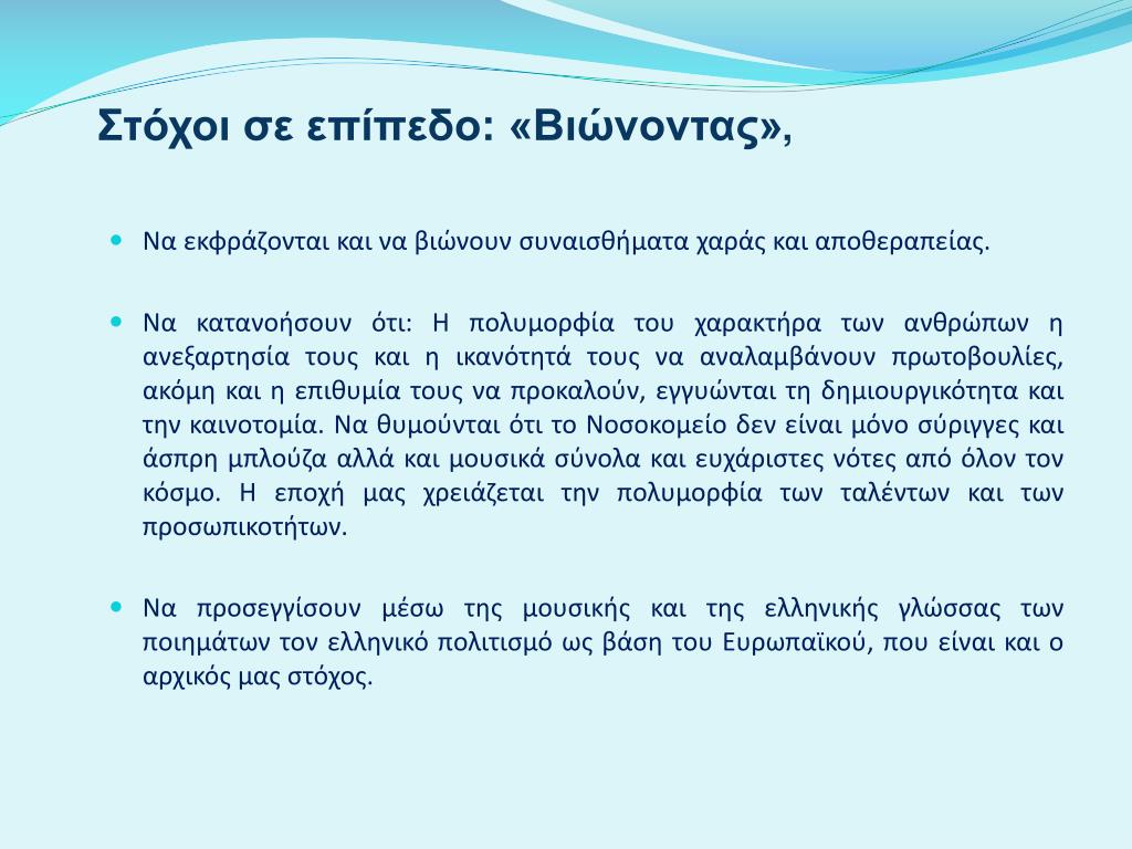 Στόχοι σε επίπεδο: «Βιώνοντας», • Να εκφράζονται και να βιώνουν συναισθήματα χαράς και αποθεραπείας. • Να κατανοήσουν ότι: Η πολυμορφία του χαρακτήρα των ανθρώπων η ανεξαρτησία τους και η ικανότητά τους να αναλαμβάνουν πρωτοβουλίες, ακόμη και η επιθυμία τους να προκαλούν, εγγυώνται τη δημιουργικότητα και την καινοτομία. Να θυμούνται ότι το Νοσοκομείο δεν είναι μόνο σύριγγες και άσπρη μπλούζα αλλά και μουσικά σύνολα και ευχάριστες νότες από όλον τον κόσμο. Η εποχή μας χρειάζεται την πολυμορφία των ταλέντων και των προσωπικοτήτων. • Να προσεγγίσουν μέσω της μουσικής και της ελληνικής γλώσσας των ποιημάτων τον ελληνικό πολιτισμό ως βάση του Ευρωπαϊκού, που είναι και ο αρχικός μας στόχος.
