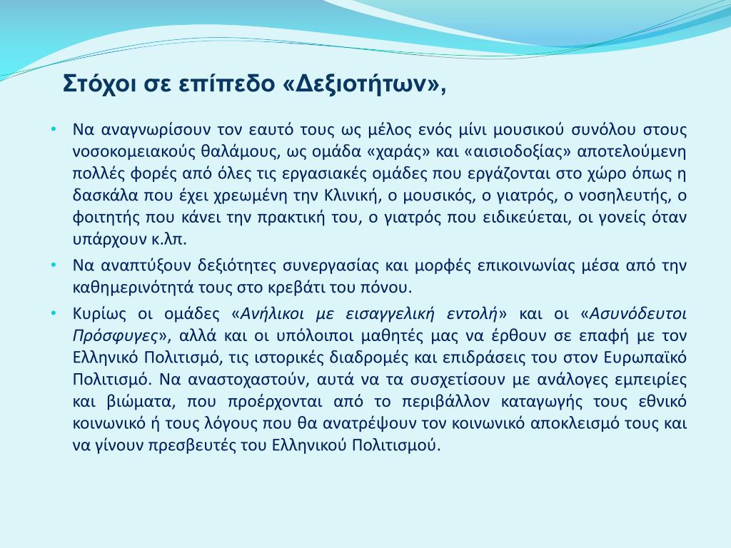 Στόχοι σε επίπεδο «Δεξιοτήτων», • Να αναγνωρίσουν τον εαυτό τους ως μέλος ενός μίνι μουσικού συνόλου στους νοσοκομειακούς θαλάμους, ως ομάδα «χαράς» και «αισιοδοξίας» αποτελούμενη πολλές φορές από όλες τις εργασιακές ομάδες που εργάζονται στο χώρο όπως η δασκάλα που έχει χρεωμένη την Κλινική, ο μουσικός, ο γιατρός, ο νοσηλευτής, ο φοιτητής που κάνει την πρακτική του, ο γιατρός που ειδικεύεται, οι γονείς όταν υπάρχουν κ.λπ. • Να αναπτύξουν δεξιότητες συνεργασίας και μορφές επικοινωνίας μέσα από την καθημερινότητά τους στο κρεβάτι του πόνου. • Κυρίως οι ομάδες «Ανήλικοι με εισαγγελική εντολή» και οι «Ασυνόδευτοι Πρόσφυγες», αλλά και οι υπόλοιποι μαθητές μας να έρθουν σε επαφή με τον Ελληνικό Πολιτισμό, τις ιστορικές διαδρομές και επιδράσεις του στον Ευρωπαϊκό Πολιτισμό. Να αναστοχαστούν, αυτά να τα συσχετίσουν με ανάλογες εμπειρίες και βιώματα, που προέρχονται από το περιβάλλον καταγωγής τους εθνικό κοινωνικό ή τους λόγους που θα ανατρέψουν τον κοινωνικό αποκλεισμό τους και να γίνουν πρεσβευτές του Ελληνικού Πολιτισμού.