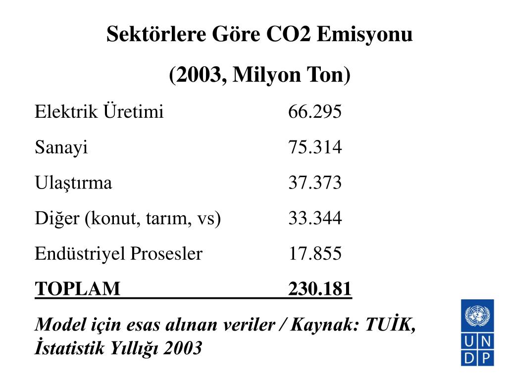 Sektörlere Göre CO2 Emisyonu (2003, Milyon Ton) Elektrik Üretimi 66.295 Sanayi 75.314 Ulaştırma 37.373 Diğer (konut, tarım, vs) 33.344 Endüstriyel Prosesler 17.855 TOPLAM 230.181 Model için esas alınan veriler / Kaynak: TUİK, İstatistik Yıllığı 2003