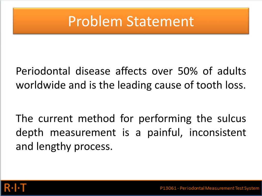 Problem Statement Periodontal disease affects over 50% of adults worldwide and is the leading cause of tooth loss. The current method for performing the sulcus depth measurement is a painful, inconsistent and lengthy process.