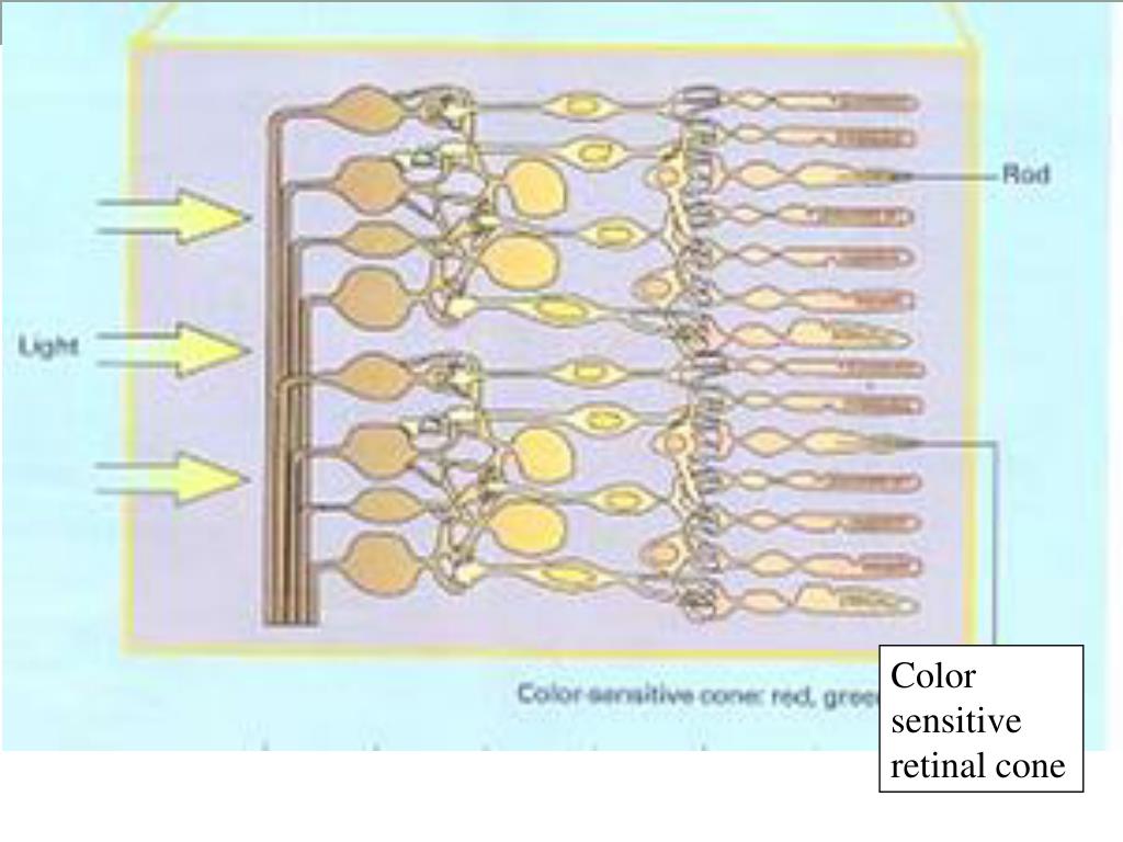 Retina has two kinds of cells that react to the light stimulus • ROD CELLS • Distinguishes the differences in lightness • RETINAL CONES • - cones; different spectral sensitiveness • Color vision