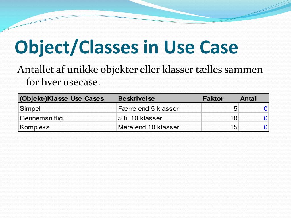 Object/Classes in Use Case Antallet af unikke objekter eller klasser tælles sammen for hver usecase.
