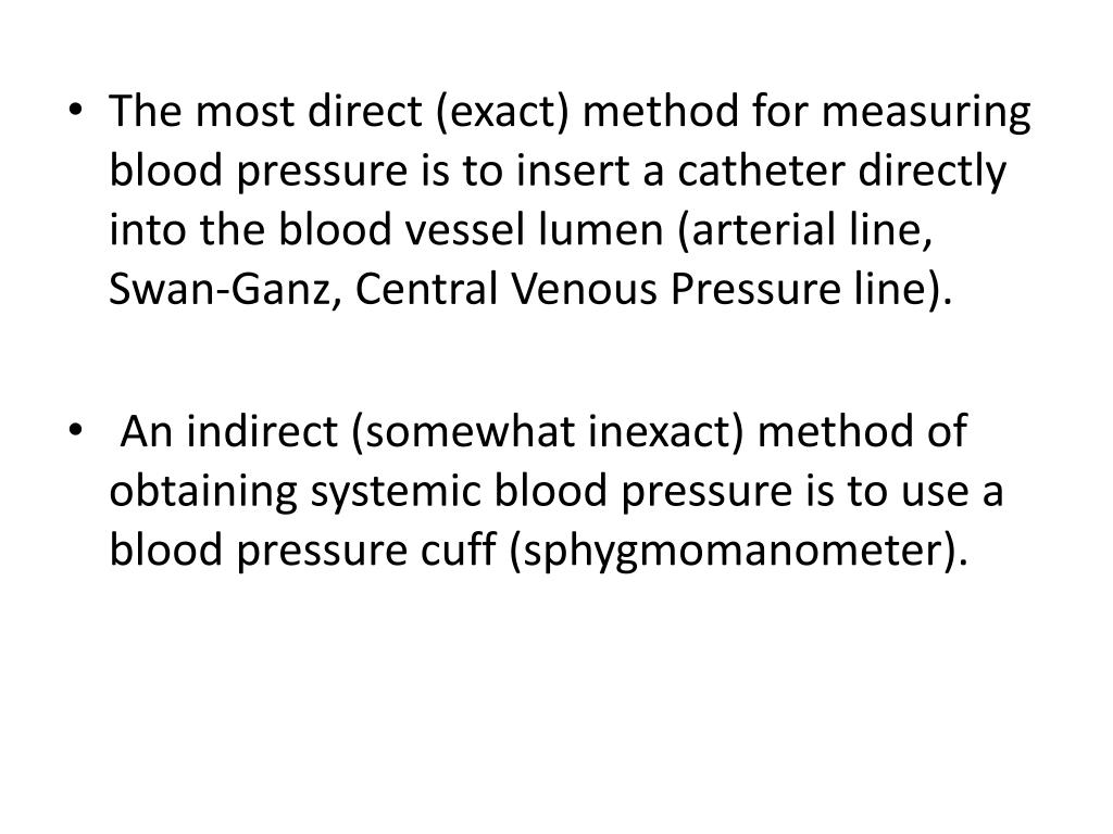 The most direct (exact) method for measuring blood pressure is to insert a catheter directly into the blood vessel lumen (arterial line, Swan-Ganz, Central Venous Pressure line). • An indirect (somewhat inexact) method of obtaining systemic blood pressure is to use a blood pressure cuff (sphygmomanometer).