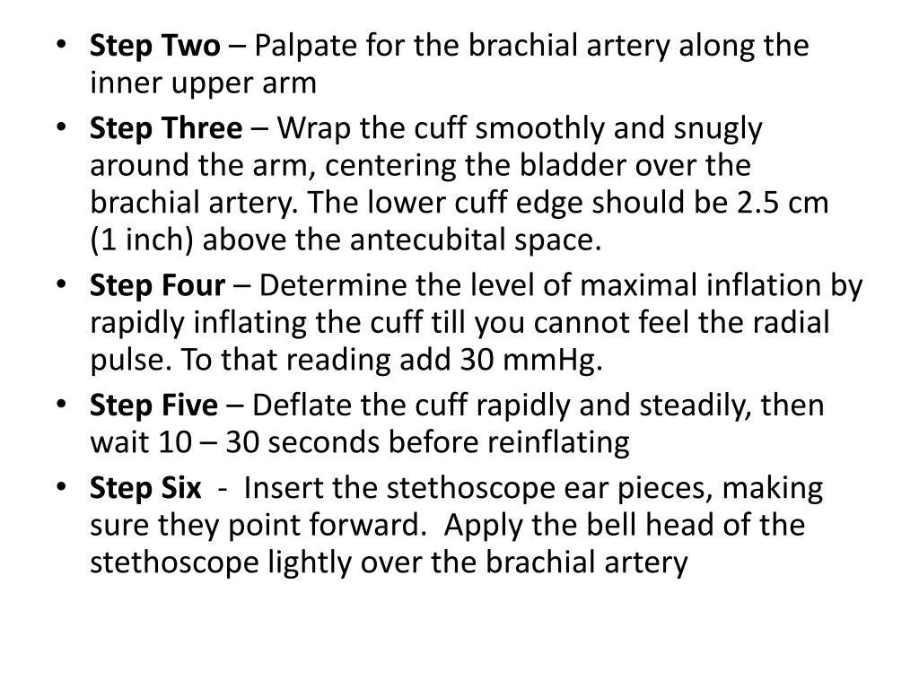 Step Two – Palpate for the brachial artery along the inner upper arm • Step Three – Wrap the cuff smoothly and snugly around the arm, centering the bladder over the brachial artery. The lower cuff edge should be 2.5 cm (1 inch) above the antecubital space. • Step Four – Determine the level of maximal inflation by rapidly inflating the cuff till you cannot feel the radial pulse. To that reading add 30 mmHg. • Step Five – Deflate the cuff rapidly and steadily, then wait 10 – 30 seconds before reinflating • Step Six - Insert the stethoscope ear pieces, making sure they point forward. Apply the bell head of the stethoscope lightly over the brachial artery