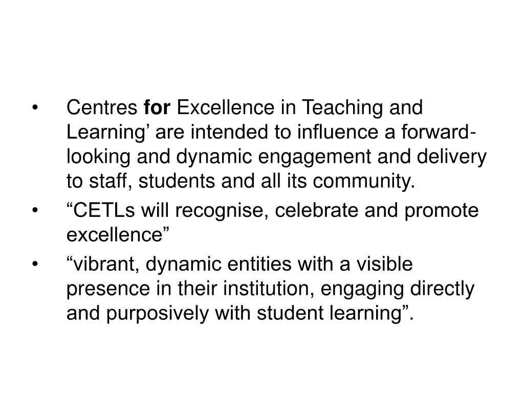 Centres for Excellence in Teaching and Learning’ are intended to influence a forward-looking and dynamic engagement and delivery to staff, students and all its community. • “CETLs will recognise, celebrate and promote excellence” • “vibrant, dynamic entities with a visible presence in their institution, engaging directly and purposively with student learning”.