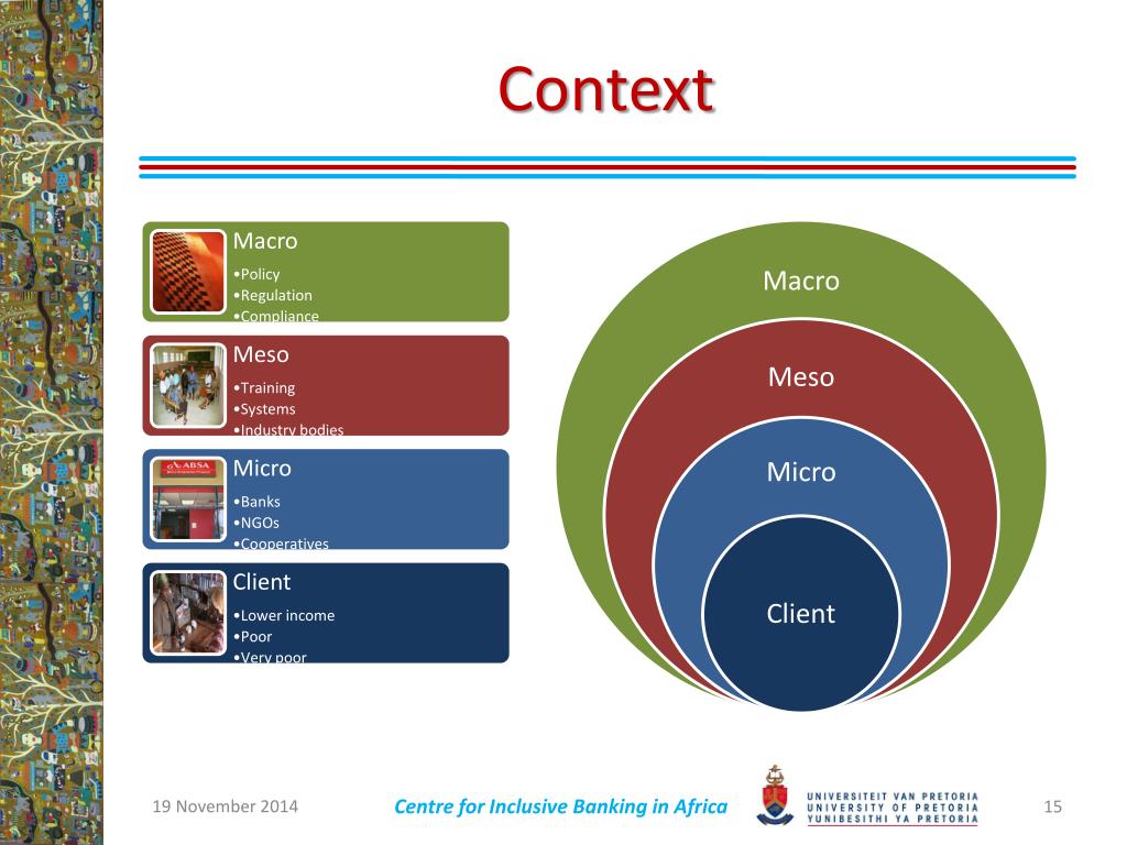 Concluding remarks Client centric – know your client (KYC) Understand the context Understand government policy objectives Understand challenges Design appropriate products and delivery systems Do not ignore international best practices Do not doggedly follow rhetoric on state/private Coordinate activities and focus Play to the strength of institutions Set targets, monitor and act Centre for Inclusive Banking in Africa