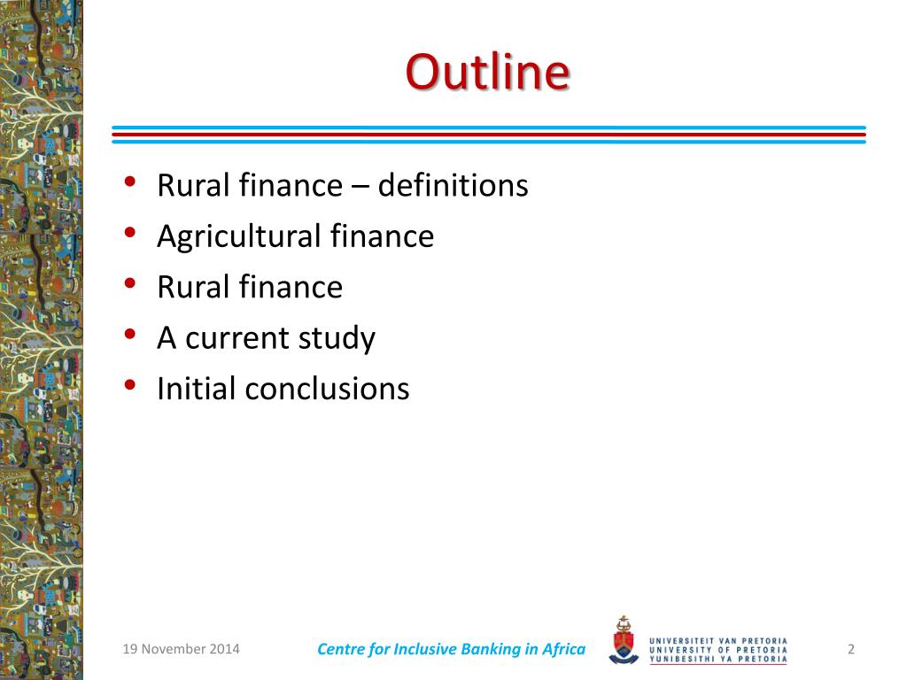 Outline Rural finance – definitions Agricultural finance Rural finance A current study Initial conclusions Centre for Inclusive Banking in Africa