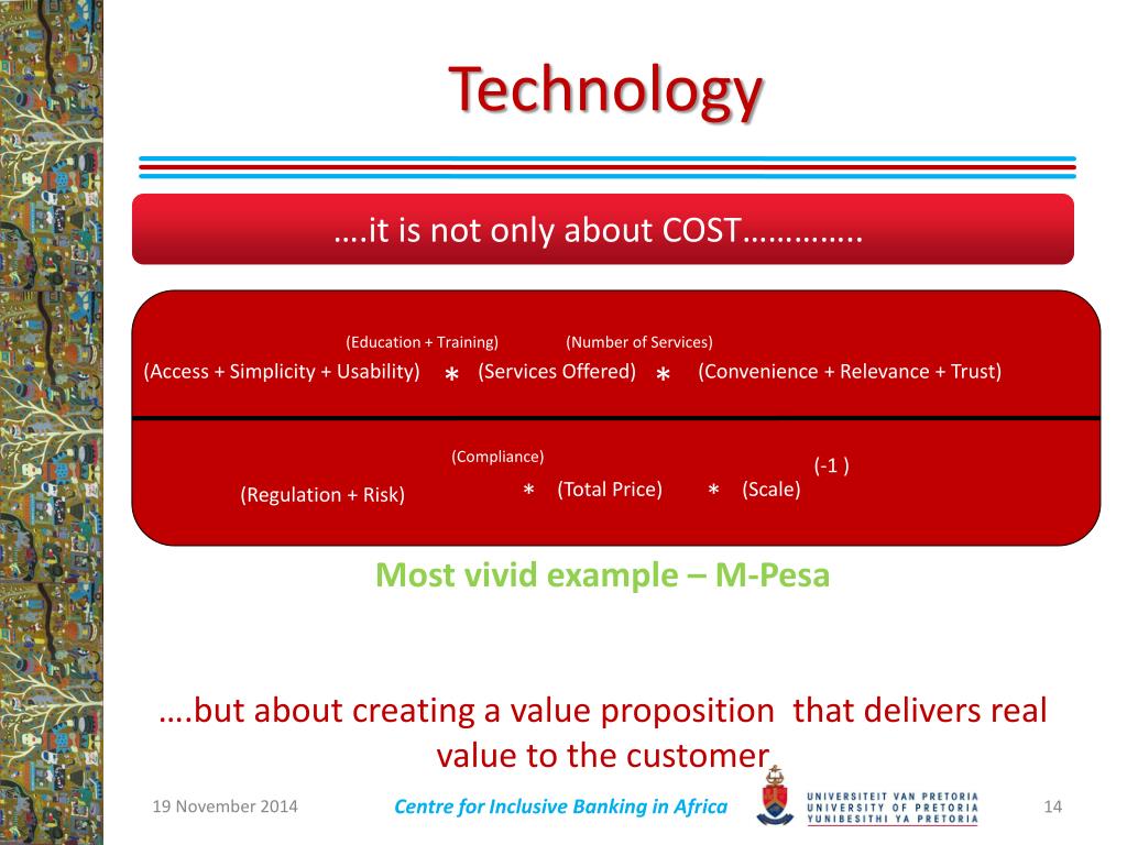Technology ….it is not only about COST………….. (Education + Training) (Number of Services) (Access + Simplicity + Usability) * (Services Offered) * (Convenience + Relevance + Trust) (Compliance) (-1 ) (Total Price) (Scale) * * (Regulation + Risk) Most vivid example – M-Pesa ….but about creating a value proposition that delivers real value to the customer Centre for Inclusive Banking in Africa
