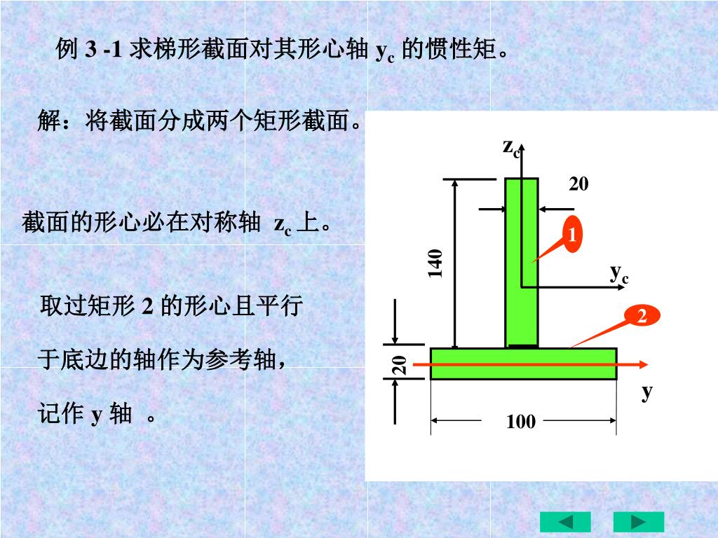 zc 1 20 yc 2 取过矩形 2 的形心且平行 140 100 y 于底边的轴作为参考轴, 记作 y 轴 。 20 例 3 -1 求梯形截面对其形心轴 yc的惯性矩。 解:将截面分成两个矩形截面。 截面的形心必在对称轴 zc 上。