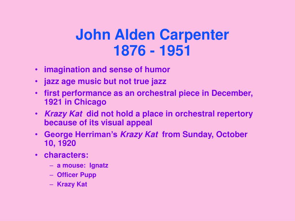 John Alden Carpenter 1876 - 1951 • imagination and sense of humor • jazz age music but not true jazz • first performance as an orchestral piece in December, 1921 in Chicago • Krazy Kat did not hold a place in orchestral repertory because of its visual appeal • George Herriman’s Krazy Kat from Sunday, October 10, 1920 • characters: • a mouse: Ignatz • Officer Pupp • Krazy Kat