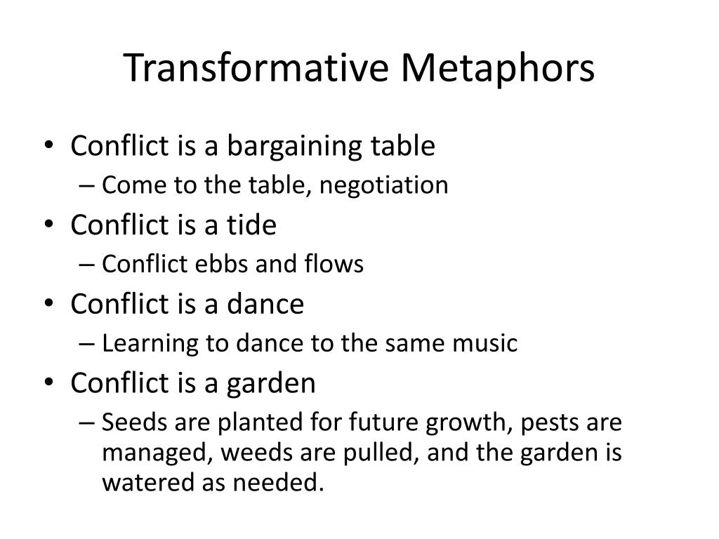 Transformative Metaphors • Conflict is a bargaining table • Come to the table, negotiation • Conflict is a tide • Conflict ebbs and flows • Conflict is a dance • Learning to dance to the same music • Conflict is a garden • Seeds are planted for future growth, pests are managed, weeds are pulled, and the garden is watered as needed.