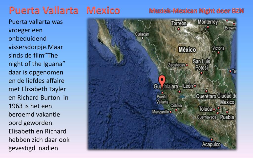 Puerta Vallarta Mexico Muziek-Mexican Night door BZN Puerta vallarta was vroeger een onbeduidend vissersdorpje.Maar sinds de film”The night of the Iguana” daar is opgenomen en de liefdes affaire met Elisabeth Tayler en Richard Burton in 1963 is het een beroemd vakantie oord geworden. Elisabeth en Richard hebben zich daar ook gevestigd nadien