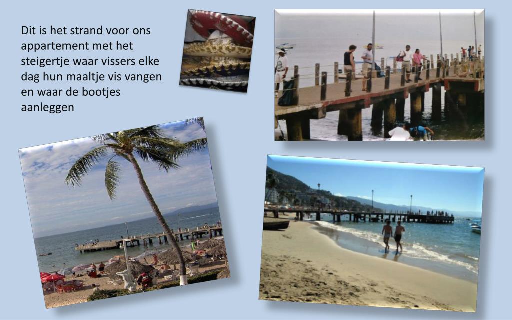Dit is het strand voor ons appartement met het steigertje waar vissers elke dag hun maaltje vis vangen en waar de bootjes aanleggen