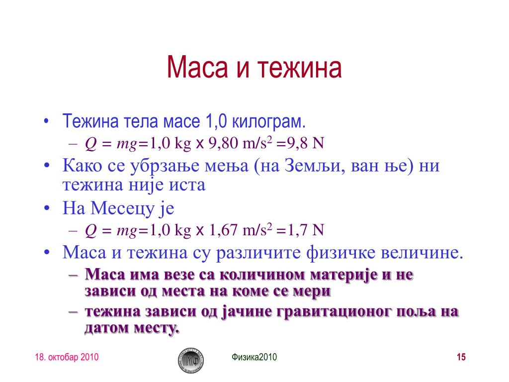 Mаса и тежина Маса и тежина су две различите величине!! Тежина је сила којом тело делује на хоризонталну подлогу, растеже опругу, затеже конац о који је обешено, ... услед деловања силе Земљине теже. Тежина и тежа нису исте величине!!! Није инхерентна карактеристика објекта!!! (Маса јесте) Тежина зависи од тога где је мерите (Земља, Месец, ...). (Маса не зависи) Физика2010