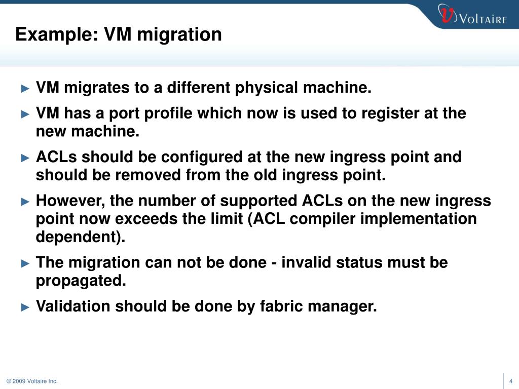 Example: VM migration • VM migrates to a different physical machine. • VM has a port profile which now is used to register at the new machine. • ACLs should be configured at the new ingress point and should be removed from the old ingress point. • However, the number of supported ACLs on the new ingress point now exceeds the limit (ACL compiler implementation dependent). • The migration can not be done - invalid status must be propagated. • Validation should be done by fabric manager.