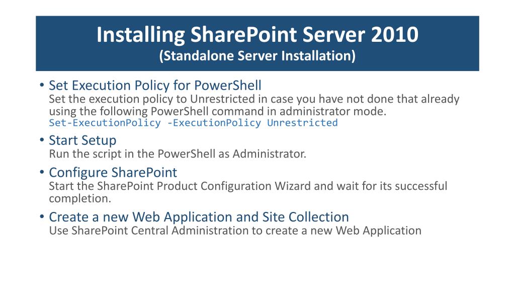 Installing SharePoint Server 2010(Standalone Server Installation) • Set Execution Policy for PowerShellSet the execution policy to Unrestricted in case you have not done that already using the following PowerShell command in administrator mode.Set-ExecutionPolicy-ExecutionPolicyUnrestricted • Start SetupRun the script in the PowerShell as Administrator. • Configure SharePointStart the SharePoint Product Configuration Wizard and wait for its successful completion. • Create a new Web Application and Site CollectionUse SharePoint Central Administration to create a new Web Application