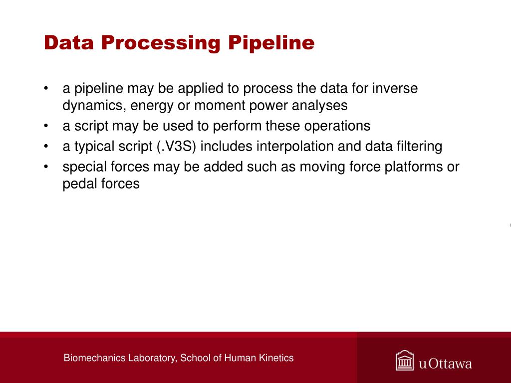 Data Processing Pipeline • a pipeline may be applied to process the data for inverse dynamics, energy or moment power analyses • a script may be used to perform these operations • a typical script (.V3S) includes interpolation and data filtering • special forces may be added such as moving force platforms or pedal forces Biomechanics Laboratory, School of Human Kinetics