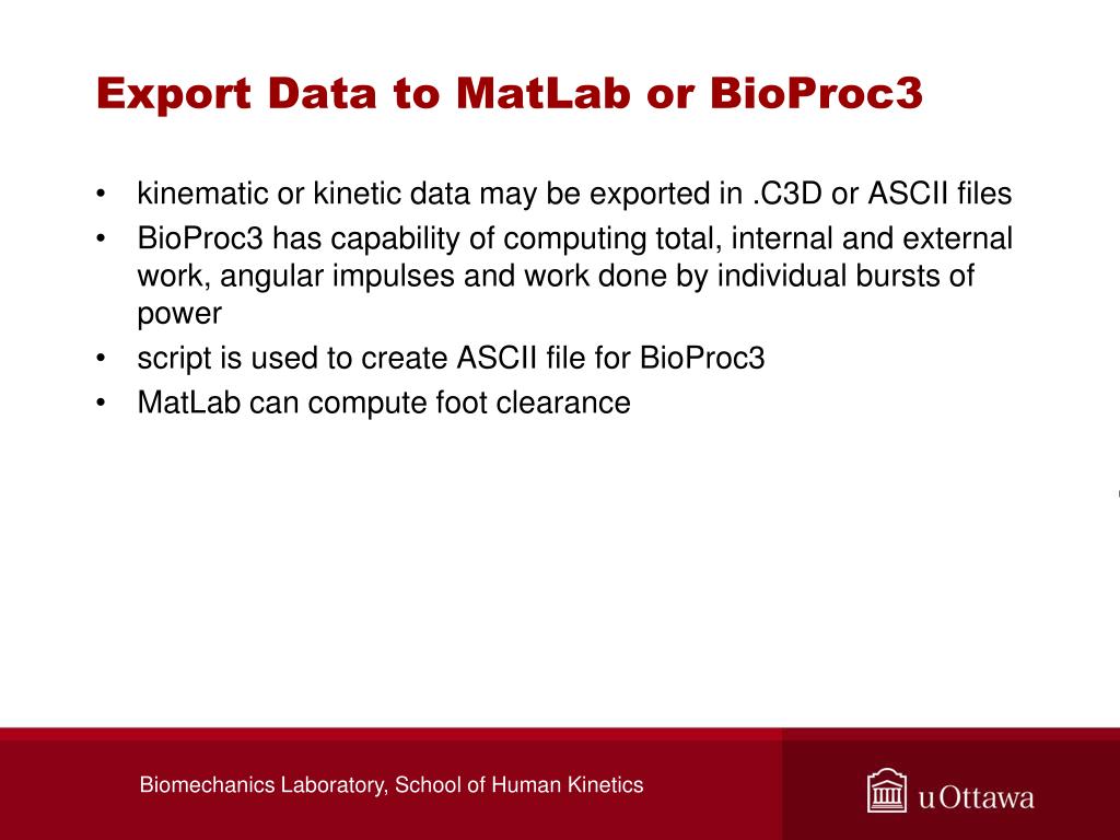 Export Data to MatLab or BioProc3 • kinematic or kinetic data may be exported in .C3D or ASCII files • BioProc3 has capability of computing total, internal and external work, angular impulses and work done by individual bursts of power • script is used to create ASCII file for BioProc3 • MatLab can compute foot clearance Biomechanics Laboratory, School of Human Kinetics
