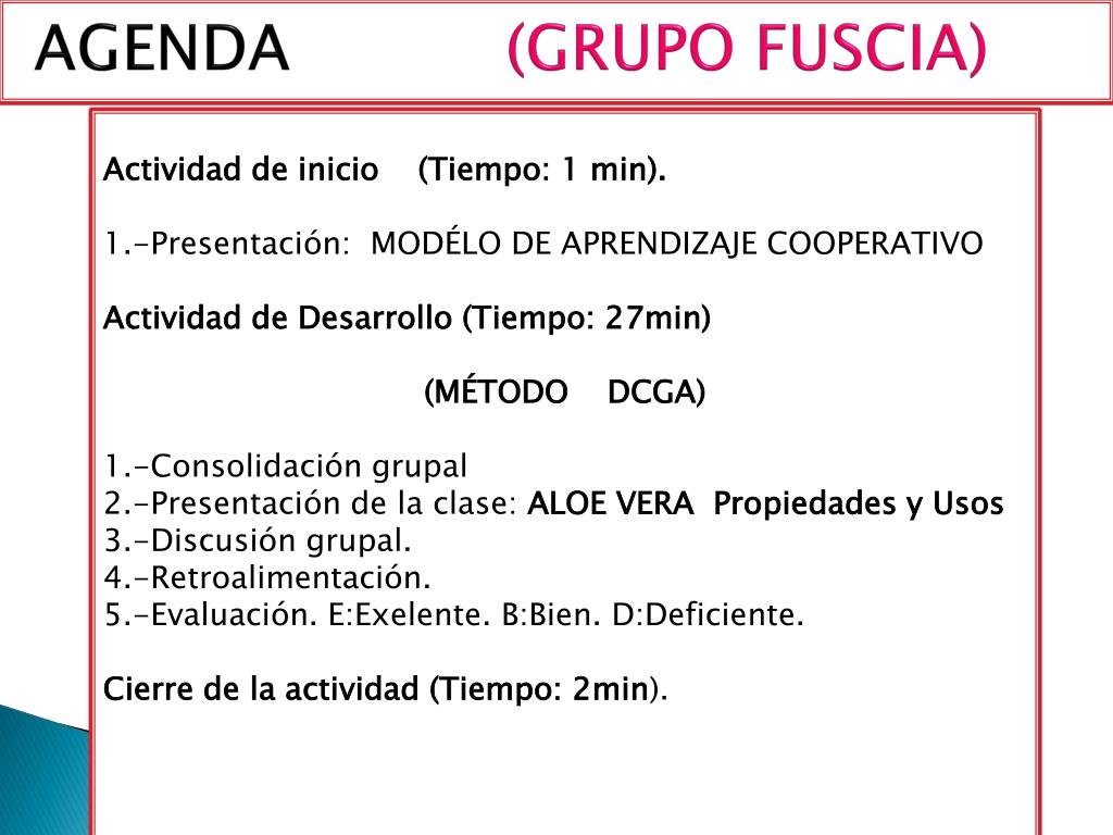 AGENDA (GRUPO FUSCIA) Actividad de inicio (Tiempo: 1 min). 1.-Presentación: MODÉLO DE APRENDIZAJE COOPERATIVO Actividad de Desarrollo (Tiempo: 27min) (MÉTODO DCGA) 1.-Consolidación grupal 2.-Presentación de la clase: ALOE VERA Propiedades y Usos 3.-Discusión grupal. 4.-Retroalimentación. 5.-Evaluación. E:Exelente. B:Bien. D:Deficiente. Cierre de la actividad (Tiempo: 2min).