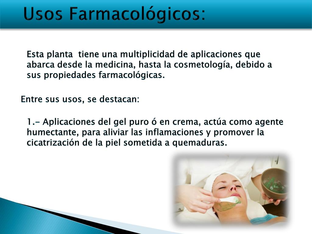 Usos Farmacológicos: Esta planta tiene una multiplicidad de aplicaciones que abarca desde la medicina, hasta la cosmetología, debido a sus propiedades farmacológicas. Entre sus usos, se destacan: 1.- Aplicaciones del gel puro ó en crema, actúa como agente humectante, para aliviar las inflamaciones y promover la cicatrización de la piel sometida a quemaduras.