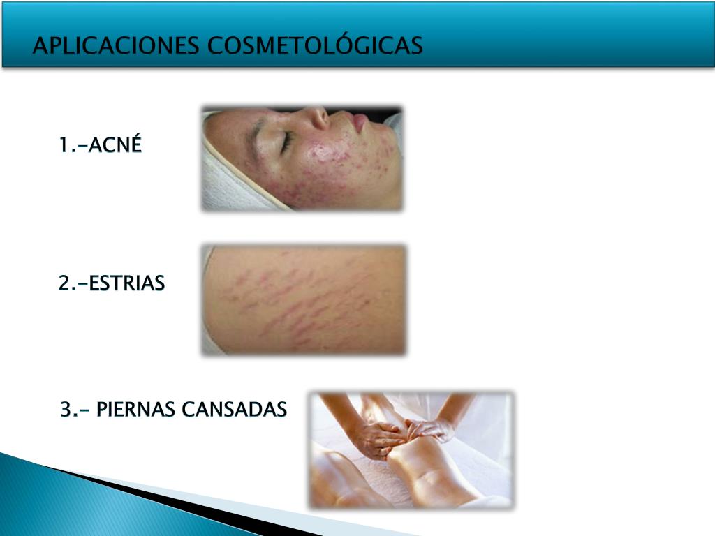 APLICACIONES COSMETOLÓGICAS 1.-ACNÉ 2.-ESTRIAS 3.- PIERNAS CANSADAS
