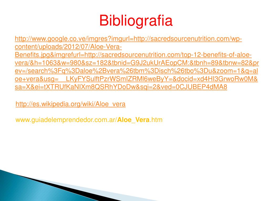 Bibliografia http://www.google.co.ve/imgres?imgurl=http://sacredsourcenutrition.com/wp-content/uploads/2012/07/Aloe-Vera-Benefits.jpg&imgrefurl=http://sacredsourcenutrition.com/top-12-benefits-of-aloe-vera/&h=1063&w=980&sz=182&tbnid=G9J2ukUrAEopCM:&tbnh=89&tbnw=82&prev=/search%3Fq%3Daloe%2Bvera%26tbm%3Disch%26tbo%3Du&zoom=1&q=aloe+vera&usg=__LKyFYSulftPzrWSmIZRMl6weByY=&docid=xd4HI3GrwoRw0M&sa=X&ei=tXTRUfKaNIXm8QSRhYDoDw&sqi=2&ved=0CJUBEP4dMA8 http://es.wikipedia.org/wiki/Aloe_vera www.guiadelemprendedor.com.ar/Aloe_Vera.htm