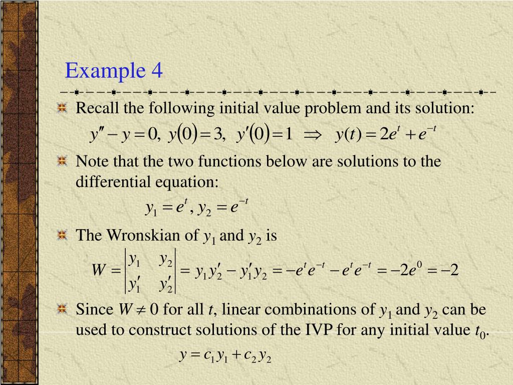 Example 4 • Recall the following initial value problem and its solution: • Note that the two functions below are solutions to the differential equation: • The Wronskian of y1 and y2 is • Since W 0 for all t, linear combinations of y1 and y2 can be used to construct solutions of the IVP for any initial value t0.