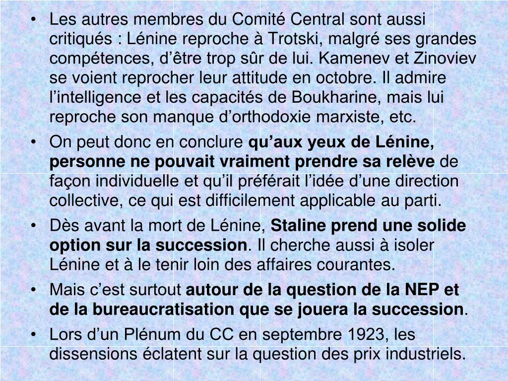 Les autres membres du Comité Central sont aussi critiqués : Lénine reproche à Trotski, malgré ses grandes compétences, d’être trop sûr de lui. Kamenev et Zinoviev se voient reprocher leur attitude en octobre. Il admire l’intelligence et les capacités de Boukharine, mais lui reproche son manque d’orthodoxie marxiste, etc. • On peut donc en conclure qu’aux yeux de Lénine, personne ne pouvait vraiment prendre sa relève de façon individuelle et qu’il préférait l’idée d’une direction collective, ce qui est difficilement applicable au parti. • Dès avant la mort de Lénine, Staline prend une solide option sur la succession. Il cherche aussi à isoler Lénine et à le tenir loin des affaires courantes. • Mais c’est surtout autour de la question de la NEP et de la bureaucratisation que se jouera la succession. • Lors d’un Plénum du CC en septembre 1923, les dissensions éclatent sur la question des prix industriels.
