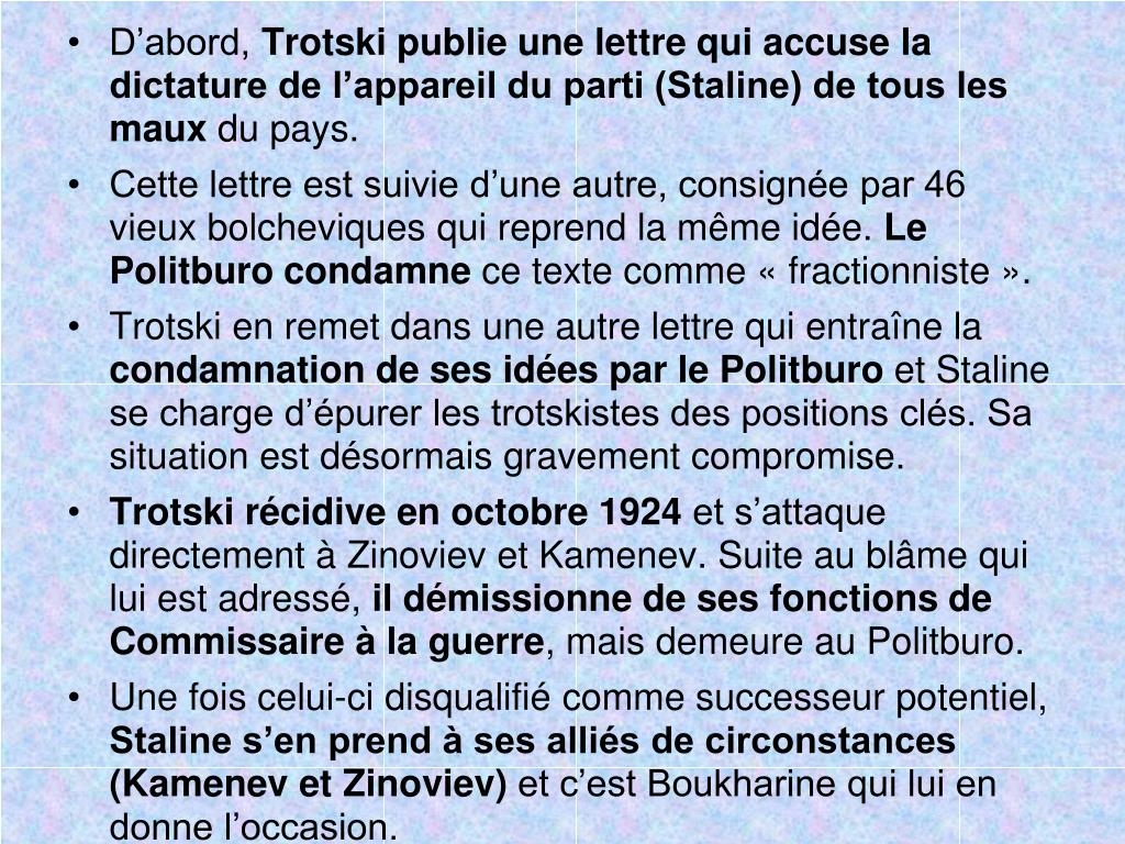 D’abord, Trotski publie une lettre qui accuse la dictature de l’appareil du parti (Staline) de tous les maux du pays. • Cette lettre est suivie d’une autre, consignée par 46 vieux bolcheviques qui reprend la même idée. Le Politburo condamne ce texte comme « fractionniste ». • Trotski en remet dans une autre lettre qui entraîne la condamnation de ses idées par le Politburo et Staline se charge d’épurer les trotskistes des positions clés. Sa situation est désormais gravement compromise. • Trotski récidive en octobre 1924 et s’attaque directement à Zinoviev et Kamenev. Suite au blâme qui lui est adressé, il démissionne de ses fonctions de Commissaire à la guerre, mais demeure au Politburo. • Une fois celui-ci disqualifié comme successeur potentiel, Staline s’en prend à ses alliés de circonstances (Kamenev et Zinoviev) et c’est Boukharine qui lui en donne l’occasion.