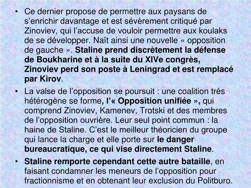 Ce dernier propose de permettre aux paysans de s’enrichir davantage et est sévèrement critiqué par Zinoviev, qui l’accuse de vouloir permettre aux koulaks de se développer. Naît ainsi une nouvelle « opposition de gauche ». Staline prend discrètement la défense de Boukharine et à la suite du XIVe congrès, Zinoviev perd son poste à Leningrad et est remplacé par Kirov. • La valse de l’opposition se poursuit : une coalition très hétérogène se forme, l’« Opposition unifiée », qui comprend Zinoviev, Kamenev, Trotski et des membres de l’opposition ouvrière. Leur seul point commun : la haine de Staline. C’est le meilleur théoricien du groupe qui lance la charge et elle porte sur le danger bureaucratique, ce qui vise directement Staline. • Staline remporte cependant cette autre bataille, en faisant condamner les meneurs de l’opposition pour fractionnisme et en obtenant leur exclusion du Politburo.