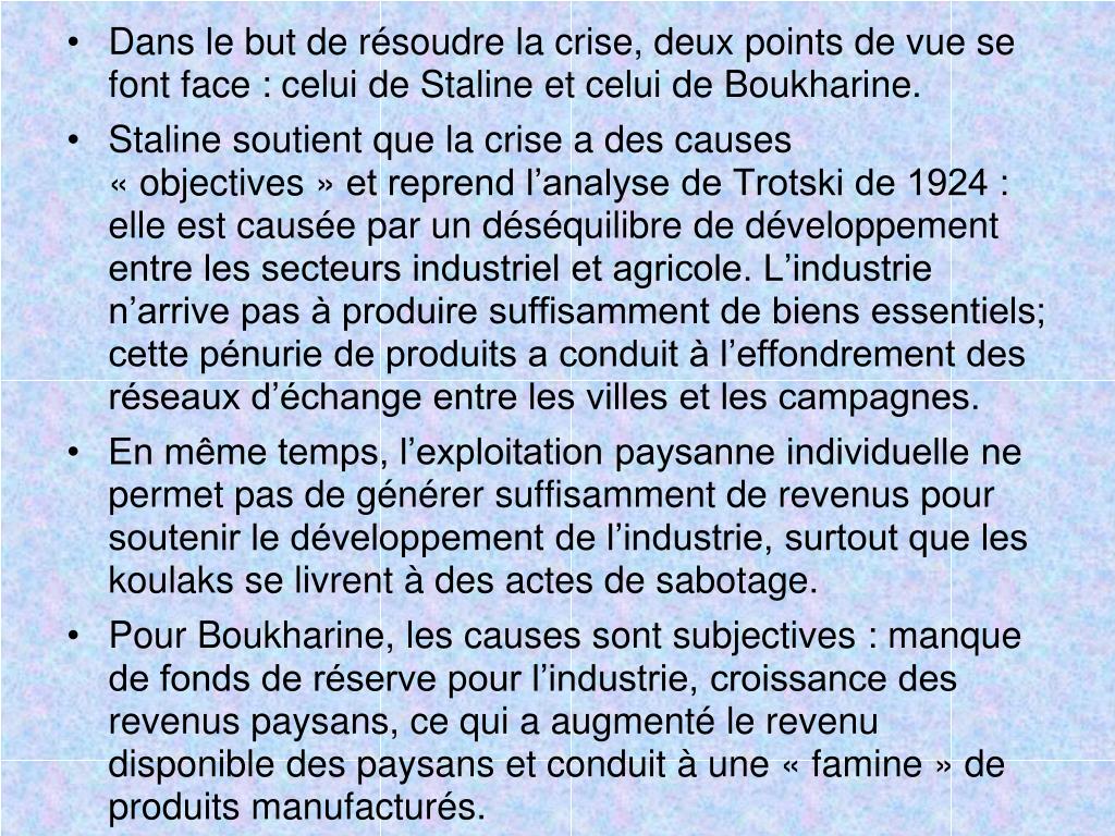 Dans le but de résoudre la crise, deux points de vue se font face : celui de Staline et celui de Boukharine. • Staline soutient que la crise a des causes « objectives » et reprend l’analyse de Trotski de 1924 : elle est causée par un déséquilibre de développement entre les secteurs industriel et agricole. L’industrie n’arrive pas à produire suffisamment de biens essentiels; cette pénurie de produits a conduit à l’effondrement des réseaux d’échange entre les villes et les campagnes. • En même temps, l’exploitation paysanne individuelle ne permet pas de générer suffisamment de revenus pour soutenir le développement de l’industrie, surtout que les koulaks se livrent à des actes de sabotage. • Pour Boukharine, les causes sont subjectives : manque de fonds de réserve pour l’industrie, croissance des revenus paysans, ce qui a augmenté le revenu disponible des paysans et conduit à une « famine » de produits manufacturés.