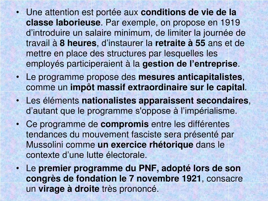 Une attention est portée aux conditions de vie de la classe laborieuse. Par exemple, on propose en 1919 d’introduire un salaire minimum, de limiter la journée de travail à 8 heures, d’instaurer la retraite à 55 ans et de mettre en place des structures par lesquelles les employés participeraient à la gestion de l’entreprise. • Le programme propose des mesures anticapitalistes, comme un impôt massif extraordinaire sur le capital. • Les éléments nationalistes apparaissent secondaires, d’autant que le programme s'oppose à l’impérialisme. • Ce programme de compromis entre les différentes tendances du mouvement fasciste sera présenté par Mussolini comme un exercice rhétorique dans le contexte d’une lutte électorale. • Le premier programme du PNF, adopté lors de son congrès de fondation le 7 novembre 1921, consacre un virage à droite très prononcé.