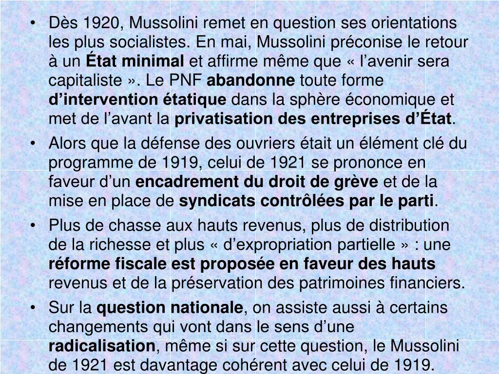 Dès 1920, Mussolini remet en question ses orientations les plus socialistes. En mai, Mussolini préconise le retour à un État minimal et affirme même que « l’avenir sera capitaliste ». Le PNF abandonne toute forme d’intervention étatique dans la sphère économique et met de l’avant la privatisation des entreprises d’État. • Alors que la défense des ouvriers était un élément clé du programme de 1919, celui de 1921 se prononce en faveur d’un encadrement du droit de grève et de la mise en place de syndicats contrôlées par le parti. • Plus de chasse aux hauts revenus, plus de distribution de la richesse et plus « d’expropriation partielle » : une réforme fiscale est proposée en faveur des hauts revenus et de la préservation des patrimoines financiers. • Sur la question nationale, on assiste aussi à certains changements qui vont dans le sens d’une radicalisation, même si sur cette question, le Mussolini de 1921 est davantage cohérent avec celui de 1919.