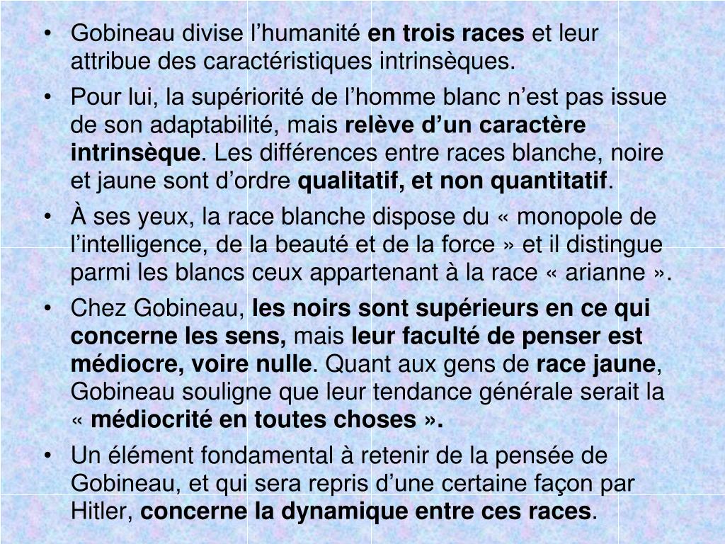 Gobineau divise l’humanité en trois races et leur attribue des caractéristiques intrinsèques. • Pour lui, la supériorité de l’homme blanc n’est pas issue de son adaptabilité, mais relève d’un caractère intrinsèque. Les différences entre races blanche, noire et jaune sont d’ordre qualitatif, et non quantitatif. • À ses yeux, la race blanche dispose du « monopole de l’intelligence, de la beauté et de la force » et il distingue parmi les blancs ceux appartenant à la race « arianne ». • Chez Gobineau, les noirs sont supérieurs en ce qui concerne les sens, mais leur faculté de penser est médiocre, voire nulle. Quant aux gens de race jaune, Gobineau souligne que leur tendance générale serait la « médiocrité en toutes choses ». • Un élément fondamental à retenir de la pensée de Gobineau, et qui sera repris d’une certaine façon par Hitler, concerne la dynamique entre ces races.