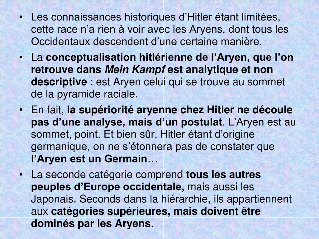 Les connaissances historiques d’Hitler étant limitées, cette race n’a rien à voir avec les Aryens, dont tous les Occidentaux descendent d’une certaine manière. • La conceptualisation hitlérienne de l’Aryen, que l’on retrouve dans Mein Kampf est analytique et non descriptive : est Aryen celui qui se trouve au sommet de la pyramide raciale. • En fait, la supériorité aryenne chez Hitler ne découle pas d’une analyse, mais d’un postulat. L’Aryen est au sommet, point. Et bien sûr, Hitler étant d’origine germanique, on ne s’étonnera pas de constater que l’Aryen est un Germain… • La seconde catégorie comprend tous les autres peuples d’Europe occidentale, mais aussi les Japonais. Seconds dans la hiérarchie, ils appartiennent aux catégories supérieures, mais doivent être dominés par les Aryens.