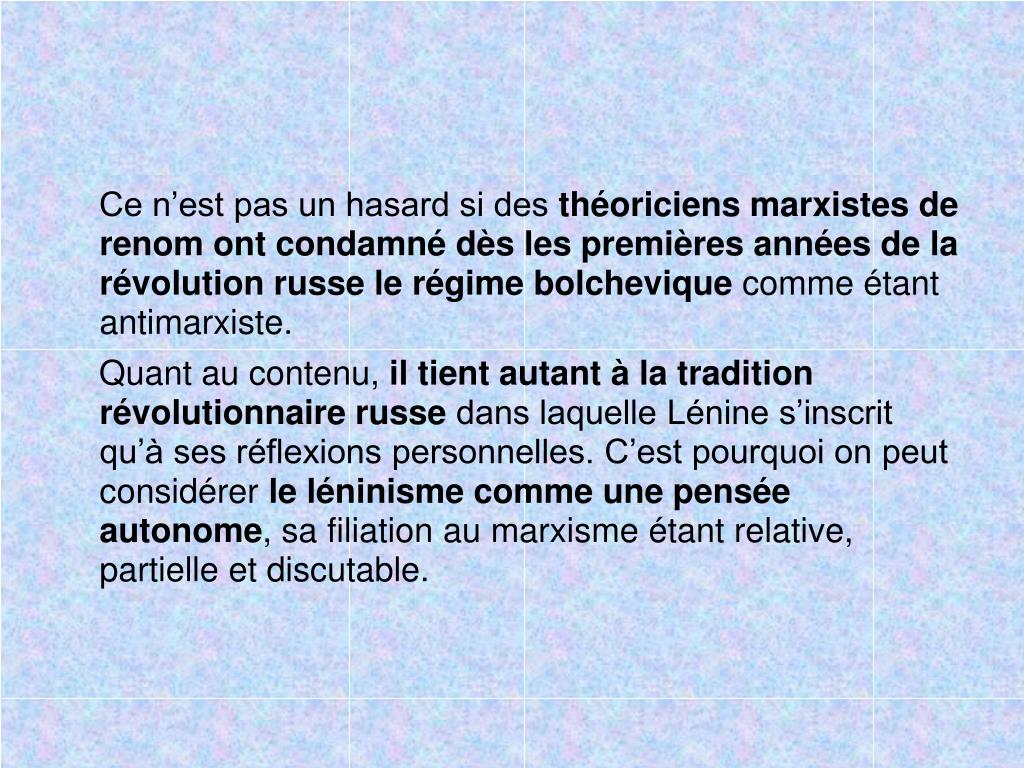 Ce n’est pas un hasard si des théoriciens marxistes de renom ont condamné dès les premières années de la révolution russe le régime bolchevique comme étant antimarxiste. Quant au contenu, il tient autant à la tradition révolutionnaire russe dans laquelle Lénine s’inscrit qu’à ses réflexions personnelles. C’est pourquoi on peut considérer le léninisme comme une pensée autonome, sa filiation au marxisme étant relative, partielle et discutable.