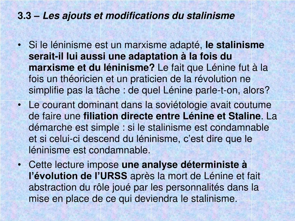 3.3 – Les ajouts et modifications du stalinisme • Si le léninisme est un marxisme adapté, le stalinisme serait-il lui aussi une adaptation à la fois du marxisme et du léninisme? Le fait que Lénine fut à la fois un théoricien et un praticien de la révolution ne simplifie pas la tâche : de quel Lénine parle-t-on, alors? • Le courant dominant dans la soviétologie avait coutume de faire une filiation directe entre Lénine et Staline. La démarche est simple : si le stalinisme est condamnable et si celui-ci descend du léninisme, c’est dire que le léninisme est condamnable. • Cette lecture impose une analyse déterministe à l’évolution de l’URSS après la mort de Lénine et fait abstraction du rôle joué par les personnalités dans la mise en place de ce qui deviendra le stalinisme.