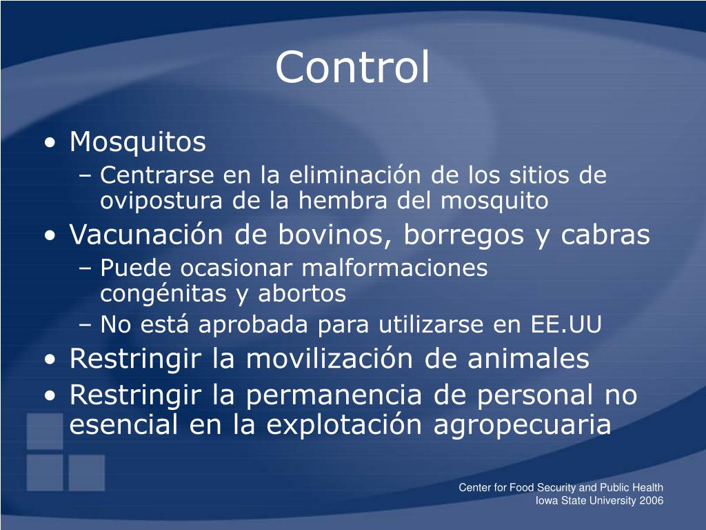 Control • Mosquitos • Centrarse en la eliminación de los sitios de ovipostura de la hembra del mosquito • Vacunación de bovinos, borregos y cabras • Puede ocasionar malformacionescongénitas y abortos • No está aprobada para utilizarse en EE.UU • Restringir la movilización de animales • Restringir la permanencia de personal no esencial en la explotación agropecuaria Center for Food Security and Public Health Iowa State University 2006