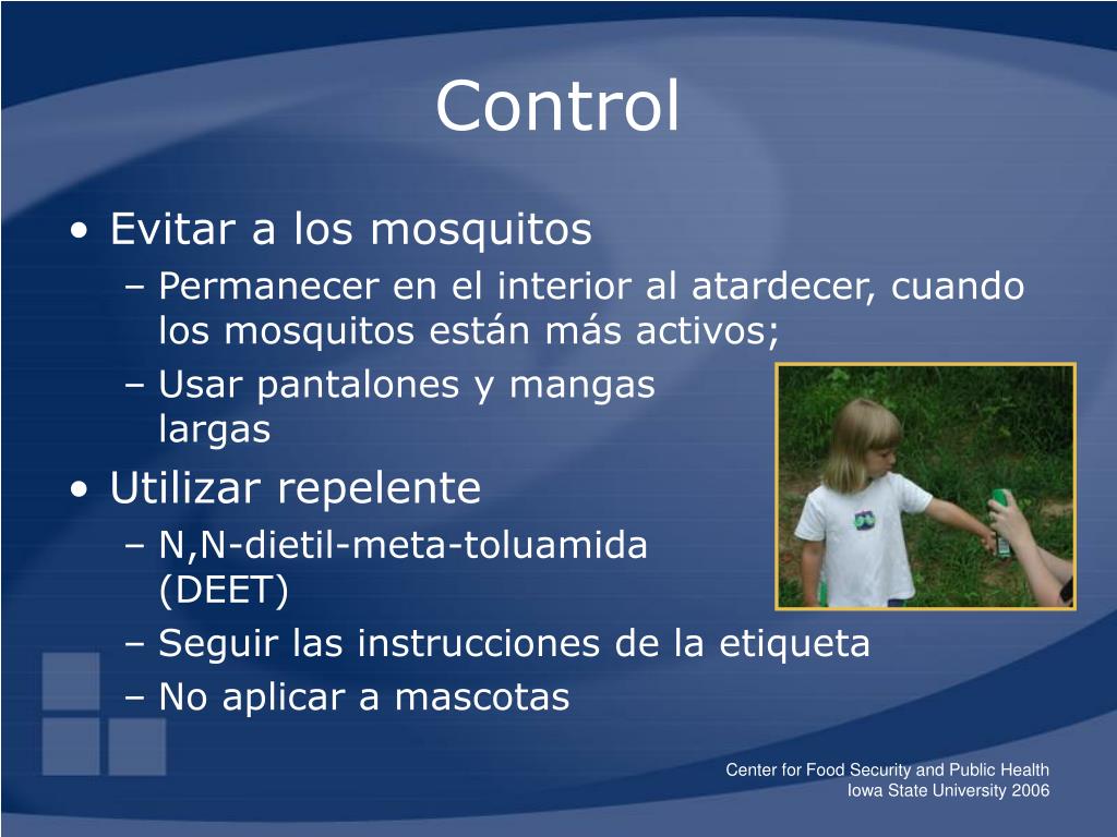 Control • Evitar a los mosquitos • Permanecer en el interior al atardecer, cuando los mosquitos están más activos; • Usar pantalones y mangaslargas • Utilizar repelente • N,N-dietil-meta-toluamida (DEET) • Seguir las instrucciones de la etiqueta • No aplicar a mascotas Center for Food Security and Public Health Iowa State University 2006